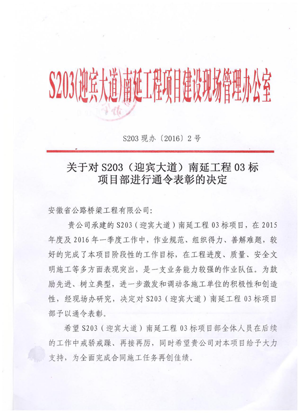 近日,由公司承建的S203(迎賓大道)南延工程03標獲得業主發文通令表彰。