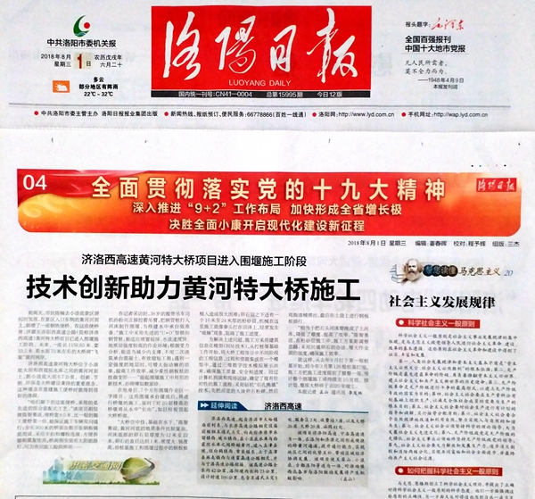 8月1日,《洛陽日報》04版刊發文章《技術創新助力黃河特大橋施工》,對公司黃河特大橋項目技術創新進行了報道。
