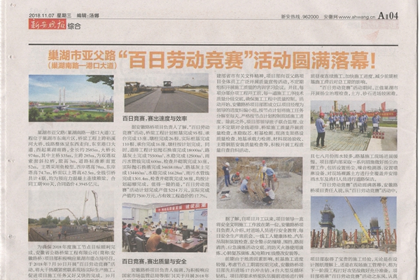 11月7日,《新安晚報環湖新聞》專題報道了公司承建的巢湖亞父路裕溪河特大橋“百日勞動競賽”活動。