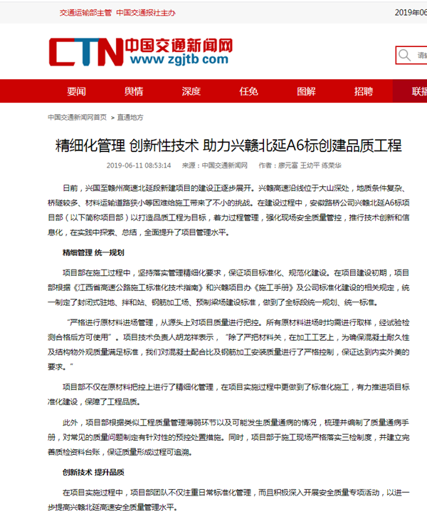 近日,中國交通新聞網以《精細化管理 創新性技術 助力興贛北延A6標創建品質工程》為題,對公司承建的江西興贛北延A6標項目建設進行了專題報道。