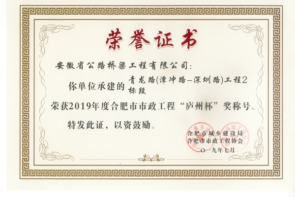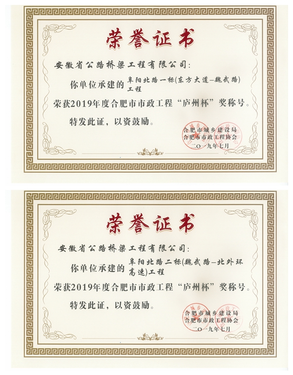 近日從合肥市政工程協(xié)會(huì)獲悉,公司承建的阜陽北路一標(biāo)、阜陽北路二標(biāo)、青龍路二標(biāo)等項(xiàng)目喜獲“廬州杯”。截至目前,市政分公司已累計(jì)獲得19個(gè)“廬州杯”獎(jiǎng)項(xiàng)。