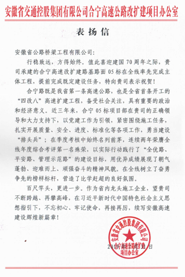 近日,合寧05標項目部收到項目辦發來的表揚信,對項目全線率先完成主體工程建設任務表示祝賀,對項目團隊管理水平、工程形象進度等工作給予了表揚。