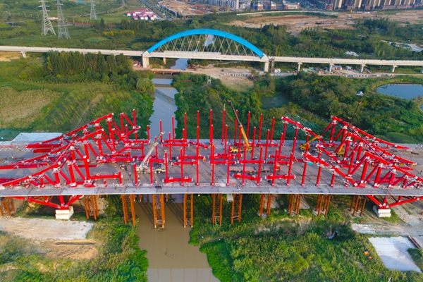 8月23日下午,隨著鋼桁主橋最后一塊橋面板的精準落位銜接,全長239.8m的集賢路跨派河鋼桁拱橋橋面成功合龍,標志著主橋已進入鋼桁拱安裝沖刺階段。