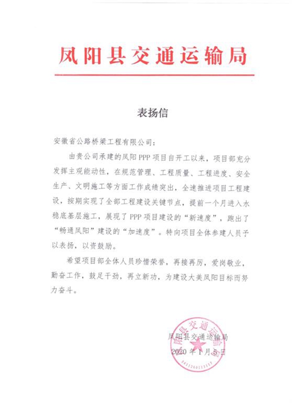 近日,鳳陽縣交通運輸局給公司投資建設的鳳陽PPP項目發來表揚信,對項目自開工以來全速推進工程建設,按期實現關鍵節點目標,以及在規范管理、工程質量、安全生產等方面所取得的成績給予了贊揚。