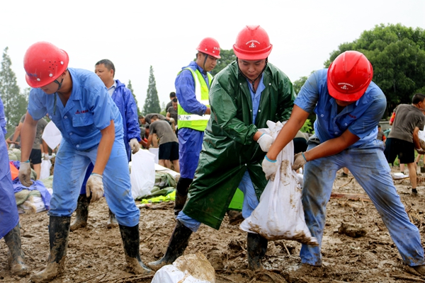 7月23日,路面公司組建的防汛抗洪搶險救援隊在完成同大圩保衛戰后,又快速集結隊伍,冒雨逆行,轉戰增援紫荊村小南河抗洪搶險,和正在參與抗洪搶險的解放軍官兵共同投入戰斗。連續6小時的冒雨奮戰,共填裝轉運沙袋5000多只,成功完成強固堤壩任務,比預定時間提前了近兩小時。
