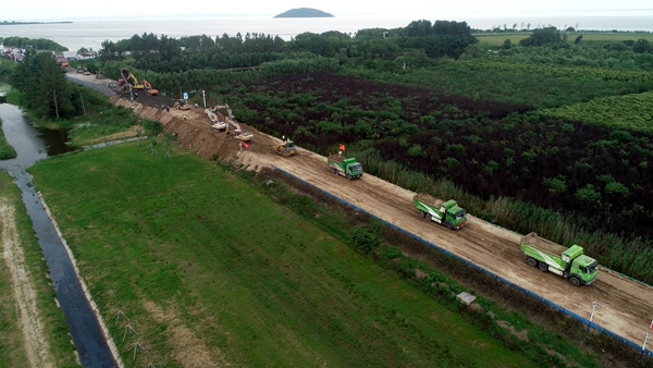 24日,環(huán)巢湖大道杭埠河堤壩上一片忙碌,路橋的抗洪尖兵們要和不斷上漲的湖水搶時間。從23日凌晨1時到24日17時,經(jīng)過40多個小時的連續(xù)作業(yè),安徽路橋順利完成道路抬升任務(wù),基本具備通行條件。但是為進一步提高通行舒適性和道路、堤壩耐久性,突擊隊伍繼續(xù)戰(zhàn)斗,開始道路水穩(wěn)施工。