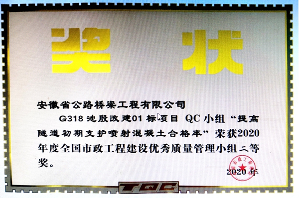 近日,從中國市政工程協會傳來喜訊,道路分公司G318池殷改建01標QC小組申報的《提高隧道初期支護噴射混凝土合格率》課題,榮獲2020年度全國市政工程建設優秀質量管理小組二等獎。此前,該項課題還榮獲了安徽省市政工程建設優秀QC小組一等獎、安徽省建設行業質量與安全協會QC成果二等獎、合肥市市政工程建設管理小組一等獎等多項殊榮。