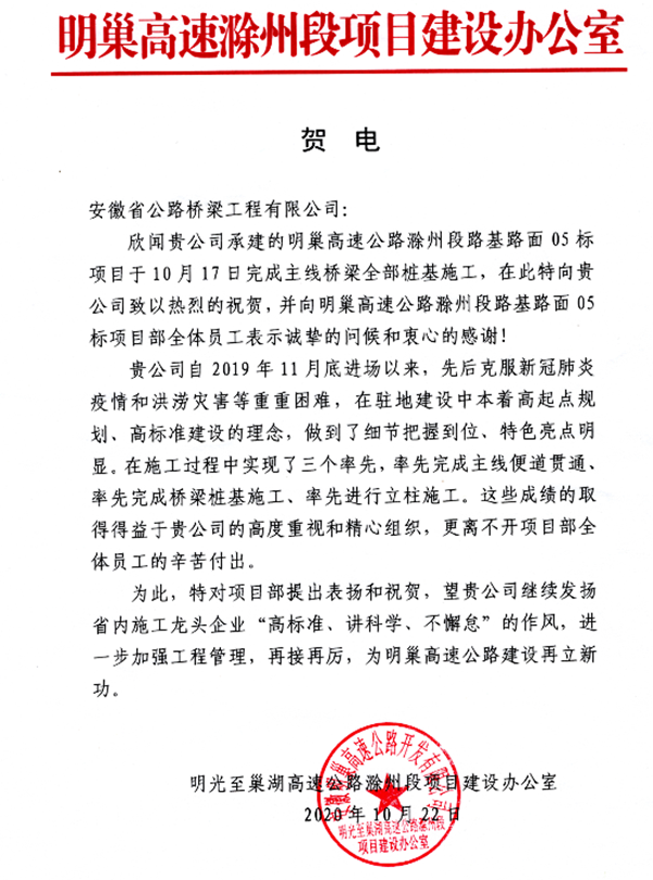 近日,明巢高速滁州段項目辦發來賀電,對公司承建的明巢高速路基路面05標項目完成主線橋梁全部樁基施工任務表示祝賀,并向全體參建人員表示感謝。