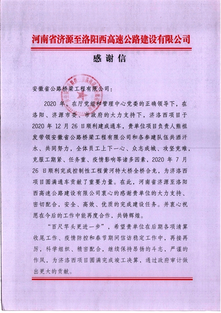 感謝信指出,黃河特大橋項目克服工期緊、任務重、疫情影響等諸多不利因素,于2020年7月26日順利完成控制性工程黃河特大橋全橋合龍施工任務,為濟洛西高速圓滿通車貢獻了力量。希望項目在接下來的工作中繼續保持昂揚的斗志,嚴謹的作風,為濟洛西高速圓滿完成竣工決算,通過審計驗收做出更大的貢獻。