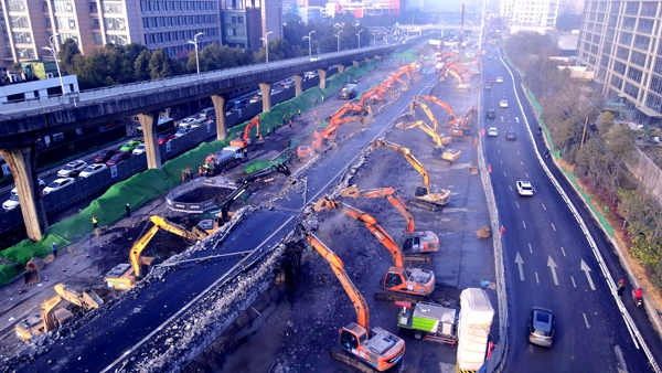 2020年12月4日22時,項(xiàng)目封閉施工,正式吹響大干的號角。26天后,首根墩柱順利澆筑。2月3日,30臺大型破碎機(jī)組成“鋼鐵戰(zhàn)隊(duì)”,僅用15個小時便完成了原計(jì)劃兩天才能完成的匝道拆除任務(wù)。3月25日,經(jīng)過35天的持續(xù)奮戰(zhàn),主線橋第四聯(lián)順利架設(shè),提前拉開了上部結(jié)構(gòu)施工的序幕。