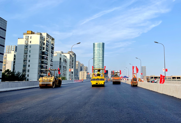 暢通二環(西南環)金寨路、合作化路節點工程主線高架橋橋面首次瀝青攤鋪順利完成