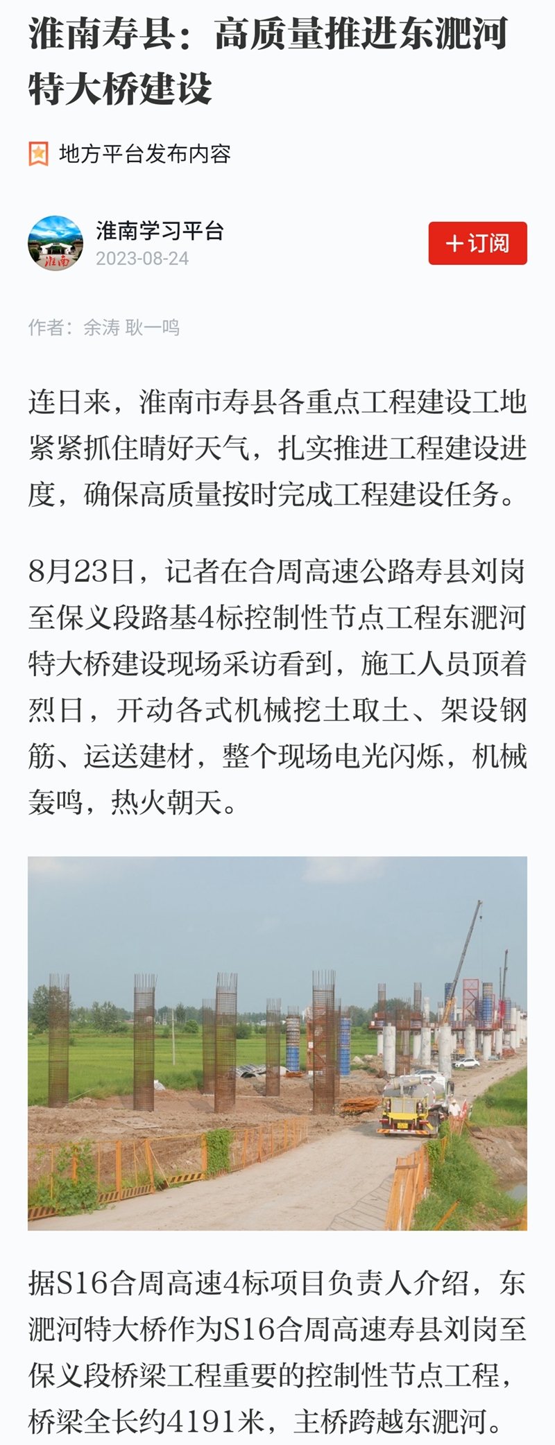 【名媒聚焦】學(xué)習(xí)強(qiáng)國(guó)——安徽路橋:高質(zhì)量推進(jìn)東淝河特大橋建設(shè)