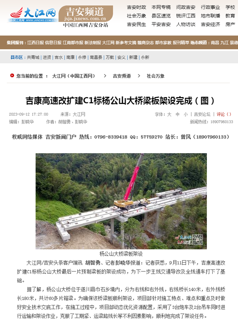 【名媒聚焦】大江網:安徽路橋吉康改擴建C1標楊公山大橋梁板架設完成
