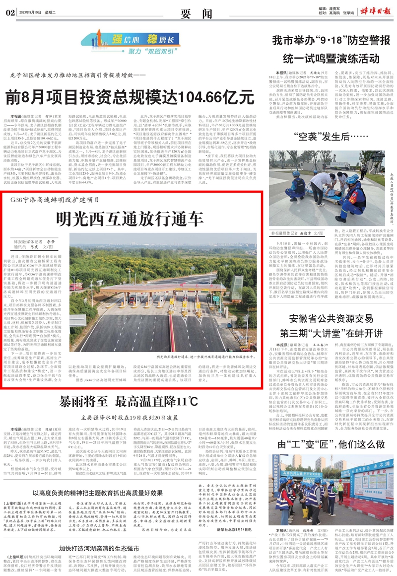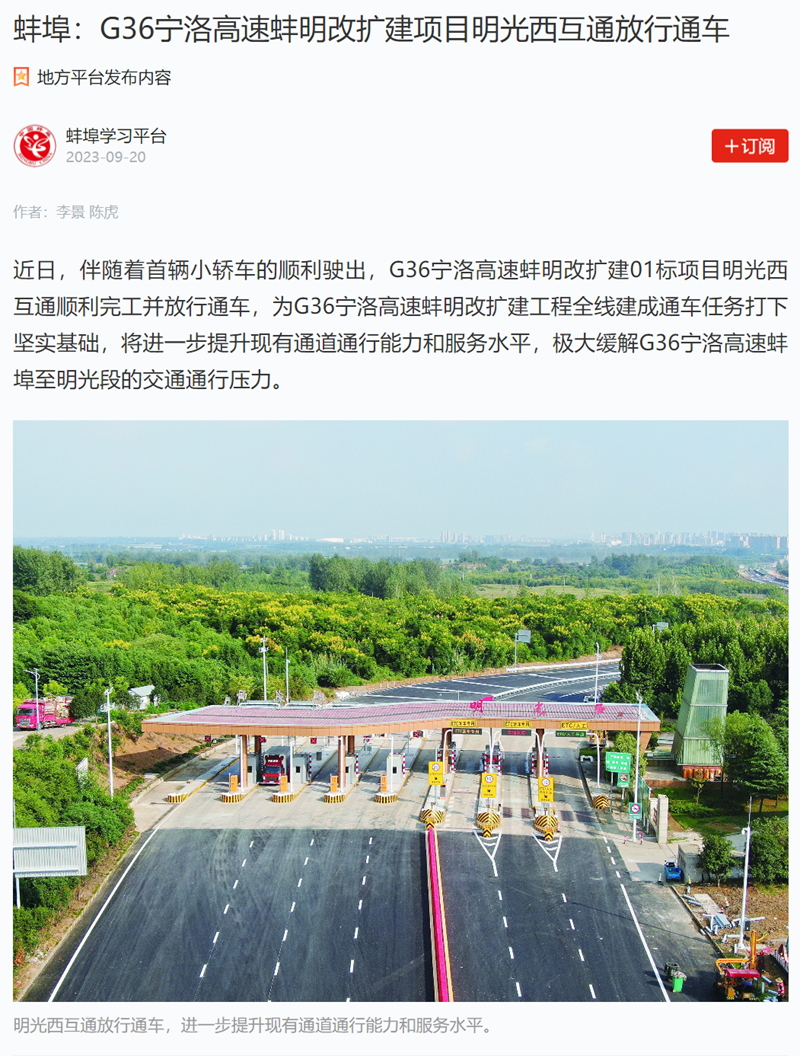 【名媒聚焦】學習強國、蚌埠日報:安徽路橋G36寧洛高速蚌明改擴建項目明光西互通放行通車