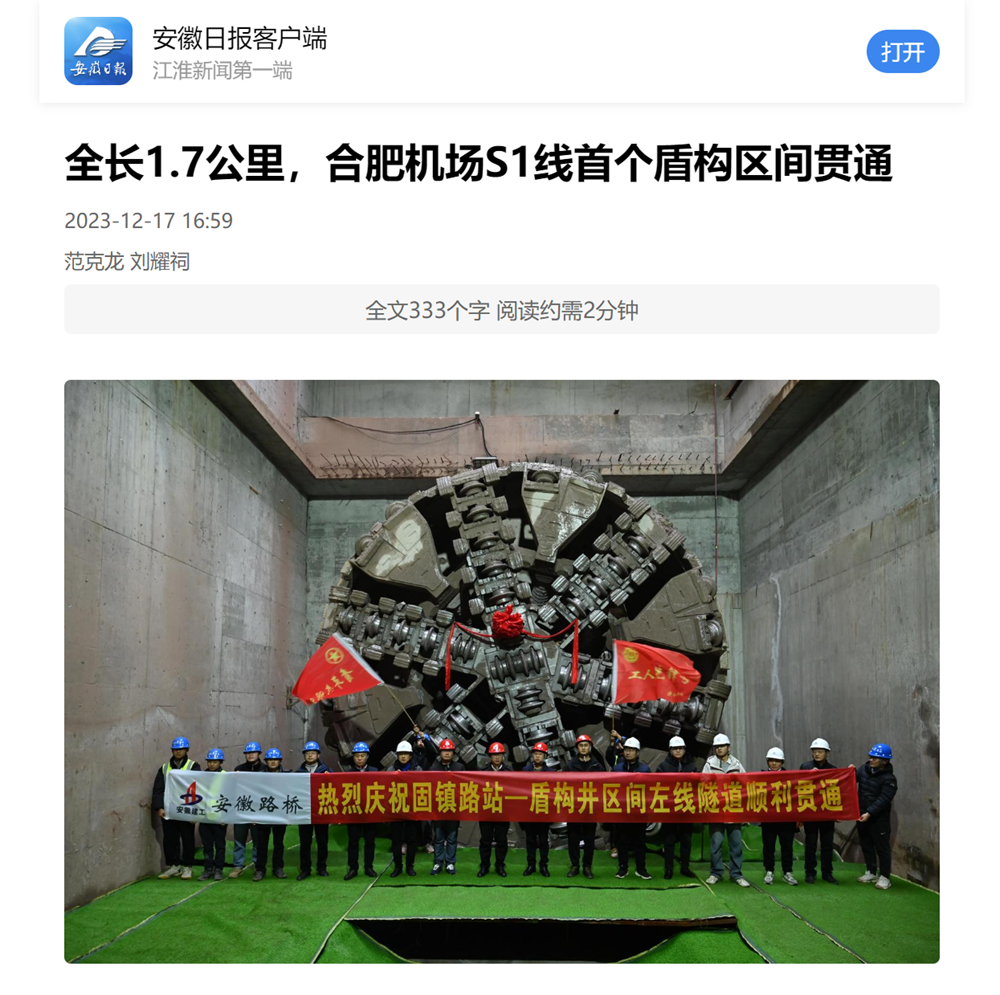 近日,公司承建的合肥新橋機(jī)場S1線固鎮(zhèn)路站至合肥西站盾構(gòu)井區(qū)間左線隧道順利貫通。作為S1線首個(gè)實(shí)現(xiàn)貫通的區(qū)間隧道,受到人民網(wǎng)、安徽日報(bào)、大皖新聞等多家主流媒體關(guān)注報(bào)道。