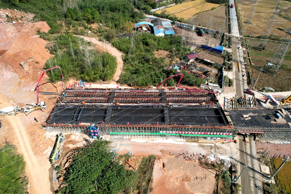 工程建設制勝在關鍵點,項目部始終堅持把關鍵節點工程攻堅作為“頭號工程”。水東四號橋位于象山腳下,橫跨鄉道施工,施工組織難度大,安全風險高。項目積極組織工作專班,通過優化方案、細化分工、倒排工期和現場監督等措施,并積極對接當地政府和有關電力部門,多番實地考察、測量,保障施工過程的有序性、高效性和安全性。2023年11月8日上午,水東四號橋首件現澆梁順利澆筑完成,標志著項目關鍵施工節點取得突破性進展。