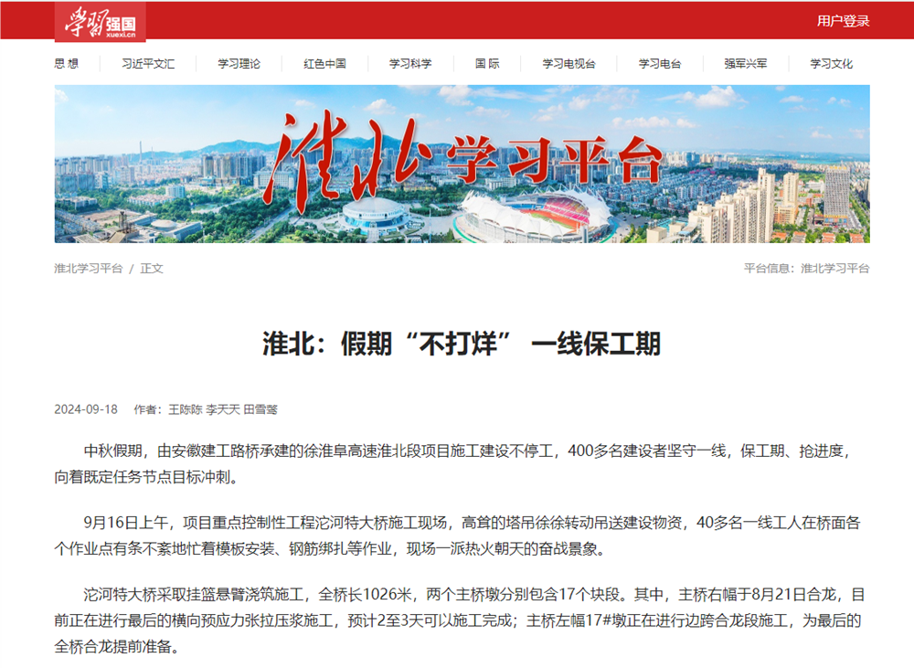 【名媒聚焦】多家主流媒體聚焦報道建工路橋項目建設 發布時間:2024年09月19日 來源:所屬各單位 發布人:黨委組織部(人力資源部、黨委宣傳部) 作者: 瀏覽:3412次 中秋假期,安徽建工路橋建設者堅守崗位一線,搶抓施工“黃金期”,沖刺節點目標,跑出實干“加速度”,受到多家主流媒體聚焦報道。學習強國淮北新聞聯播淮北日報合肥新聞聯播合肥新聞聯播