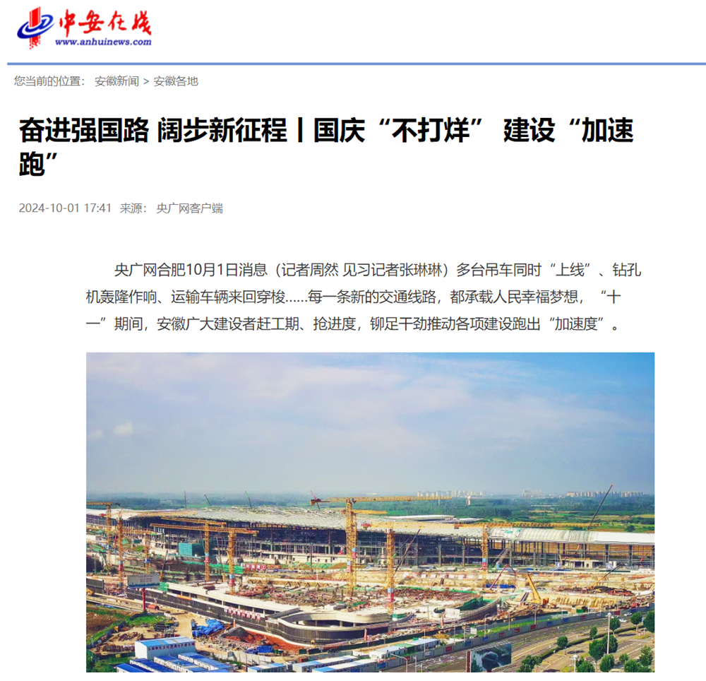 國慶假期,公司所屬各重點項目“不打烊”,推動項目建設(shè)“加速跑”,受到中央廣播電視總臺、新華社、央廣網(wǎng)、安徽衛(wèi)視、中安在線等國家和省部級主流媒體聚焦報道。