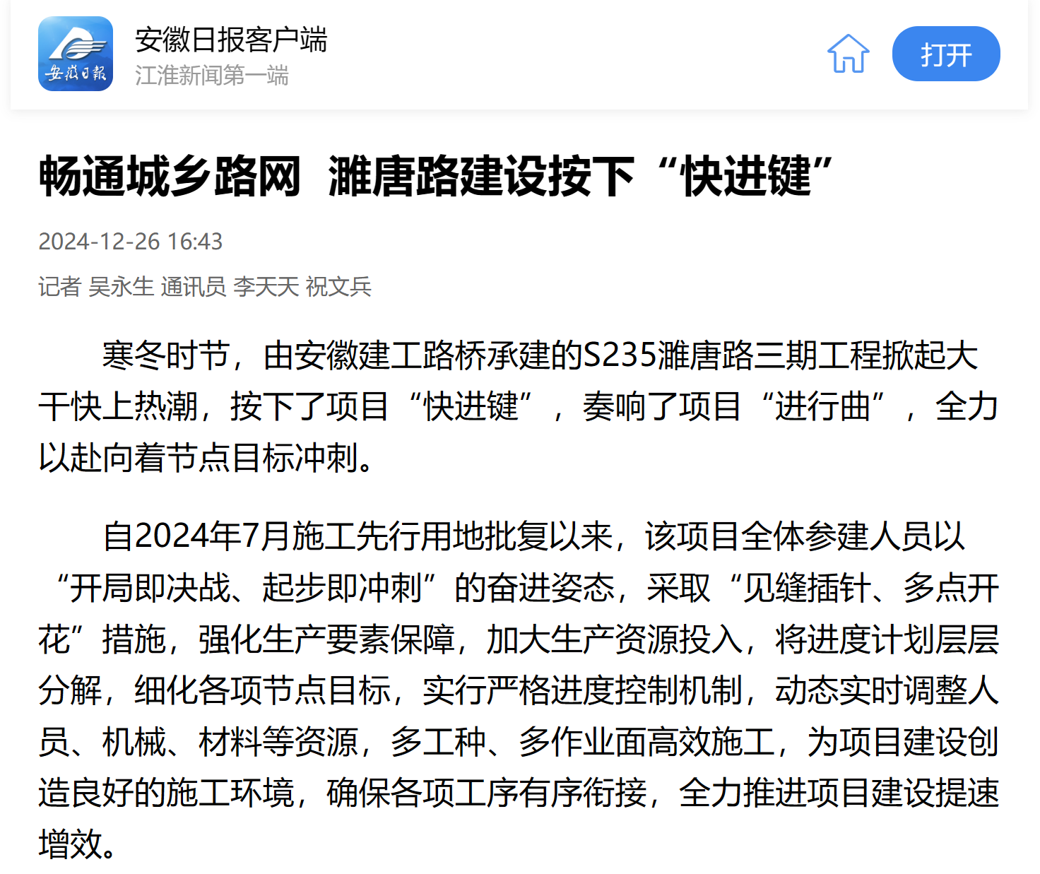 【名媒聚焦】安徽日報客戶端:暢通城鄉路網 S235濉唐路三期項目建設按下“快進鍵”