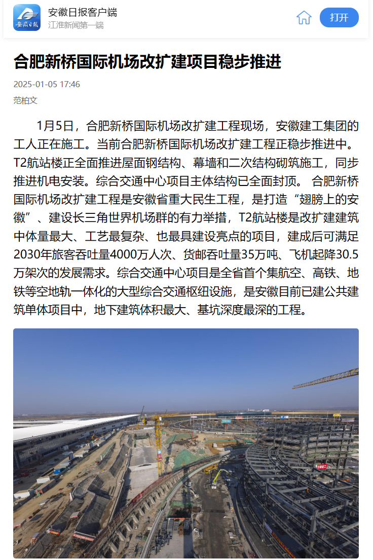 合肥新橋國際機場改擴建工程是安徽省重大民生工程,是打造“翅膀上的安徽”、建設長三角世界機場群的有力舉措,T2航站樓是改擴建建筑中體量最大、工藝最復雜、也最具建設亮點的項目,建成后可滿足2030年旅客吞吐量4000萬人次、貨郵吞吐量35萬噸、飛機起降30.5萬架次的發展需求。綜合交通中心項目是全省首個集航空、高鐵、地鐵等空地軌一體化的大型綜合交通樞紐設施,是安徽目前已建公共建筑單體項目中,地下建筑體積最大、基坑深度最深的工程。