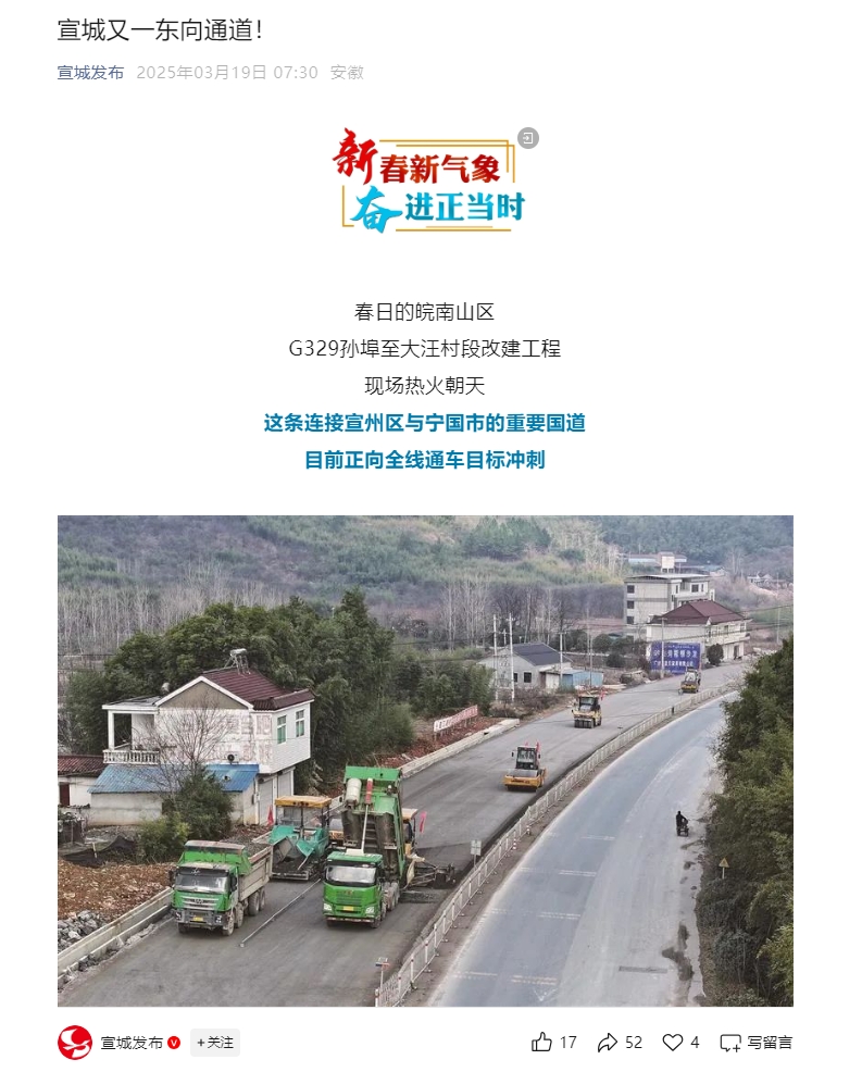 春日的皖南山區,G329孫埠至大汪村段改建工程現場熱火朝天。攤鋪機、壓路機與運輸車輛轟鳴交織,滾燙的瀝青蒸騰起陣陣白霧。這條連接宣州區與寧國市的重要國道,目前正向全線通車目標沖刺。作為融入長三角的重要通道,項目建成后,宣城至寧國通行時間將大大縮短,惠及沿線10萬余群眾。