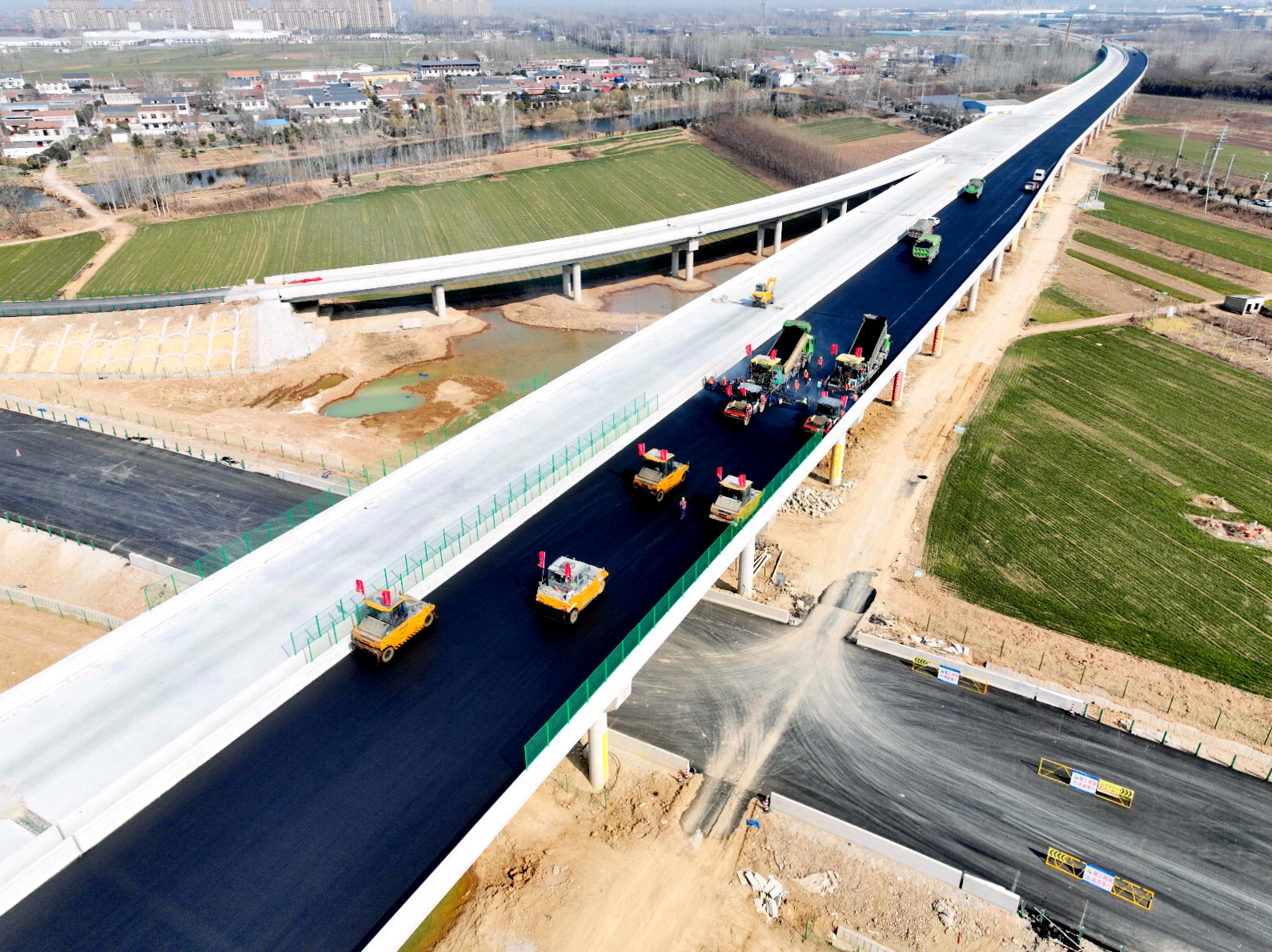 在徐淮阜高速淮北段,項目錨定7月通車目標,堅持節假日施工“不斷檔”,順利完成全線水穩攤鋪施工,正加速推進瀝青路面施工。