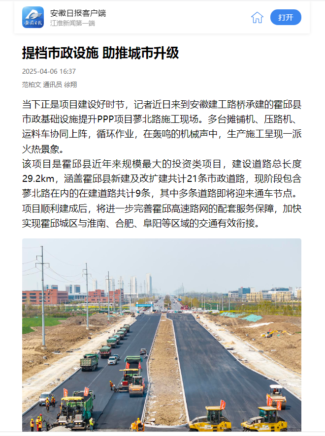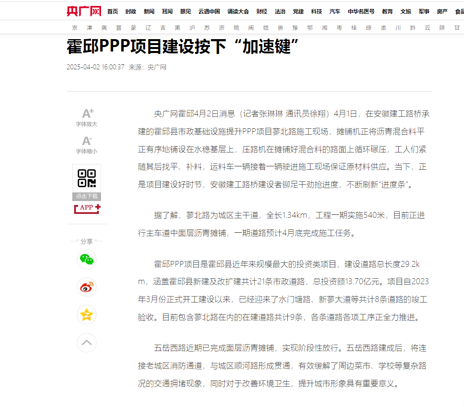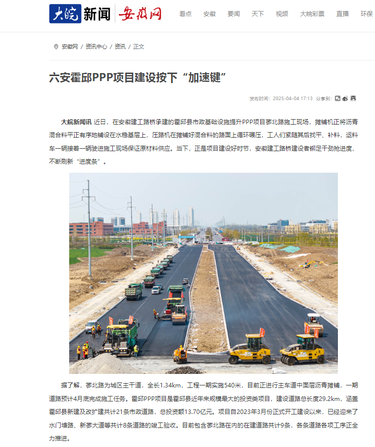 【名媒聚焦】央廣網、安徽日報:安徽建工路橋霍邱PPP項目建設按下“加速鍵”