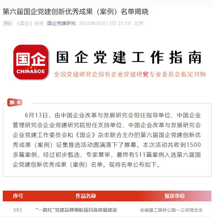 近日,中國(guó)企業(yè)改革與發(fā)展研究會(huì)企業(yè)黨建工作委員會(huì)和《國(guó)企》雜志聯(lián)合主辦的第六屆國(guó)企黨建創(chuàng)新優(yōu)秀成果(案例)征集推選活動(dòng)圓滿落下帷幕,公司《“一路紅”黨建品牌領(lǐng)航項(xiàng)目高質(zhì)量建設(shè)》黨建案例從1500多篇案例中脫穎而出,獲評(píng)第六屆國(guó)企黨建創(chuàng)新優(yōu)秀成果(案例)。