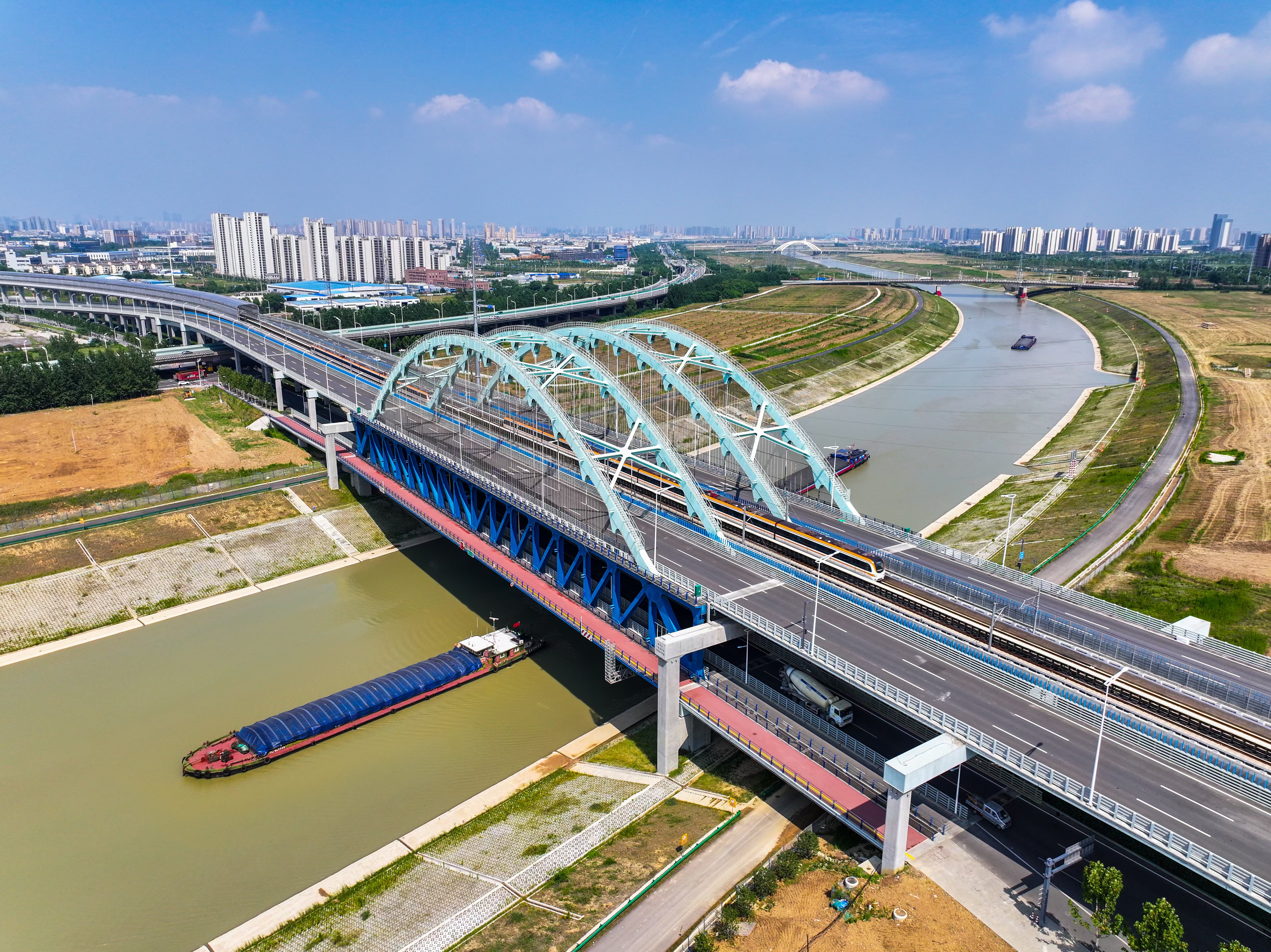 城軌雙層鋼桁架橋由跨中向兩端拱腳合龍施工技術,采用了主橋鋼桁架由跨中向兩端拱腳安裝的新工藝,調整后的施工方法無需等到墩柱施工完成再進行鋼梁架設,主橋跨中鋼桁架的架設與兩端承臺墩柱可同步施工,施工進度快。該項技術成功應用于引江濟淮繁華大道橋,有效節省工期60天,降低成本近90萬元。