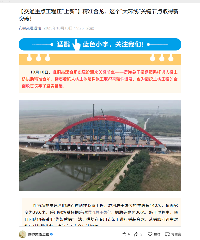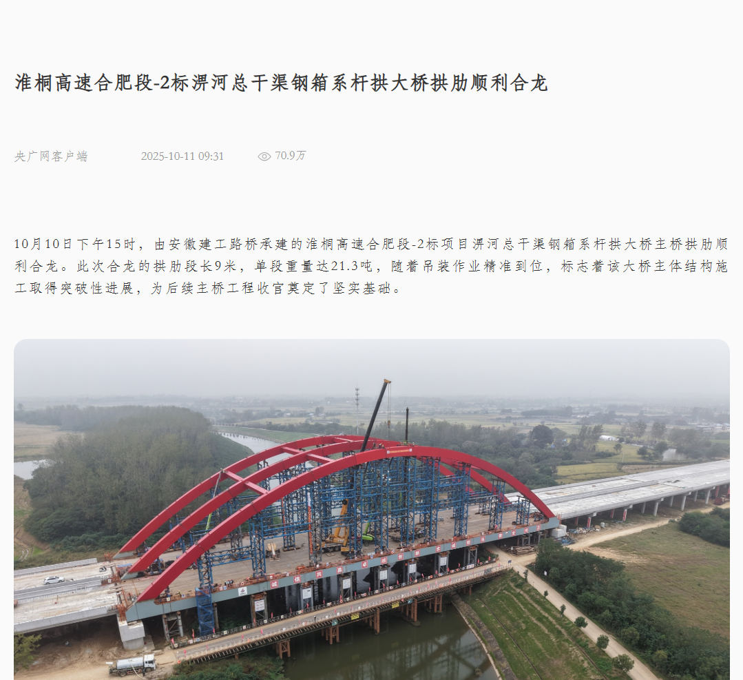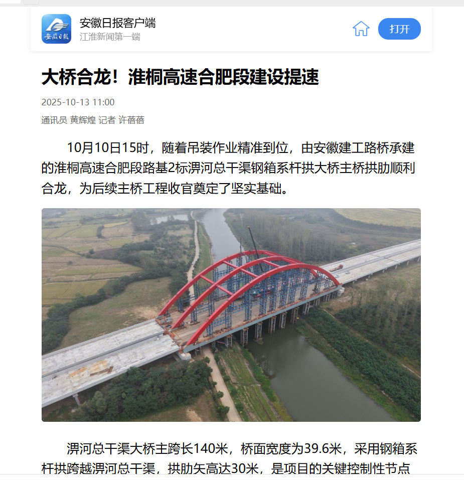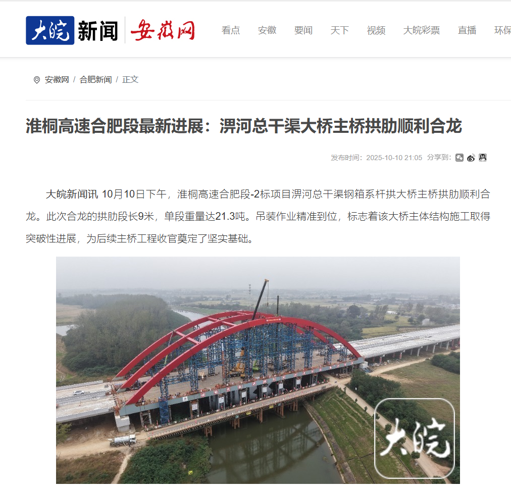 近日,央廣網(wǎng)、安徽日報、安徽交通運輸、大皖新聞等主流媒體聚焦報道淮桐高速合肥段路基2標(biāo)淠河總干渠大橋拱肋合龍。