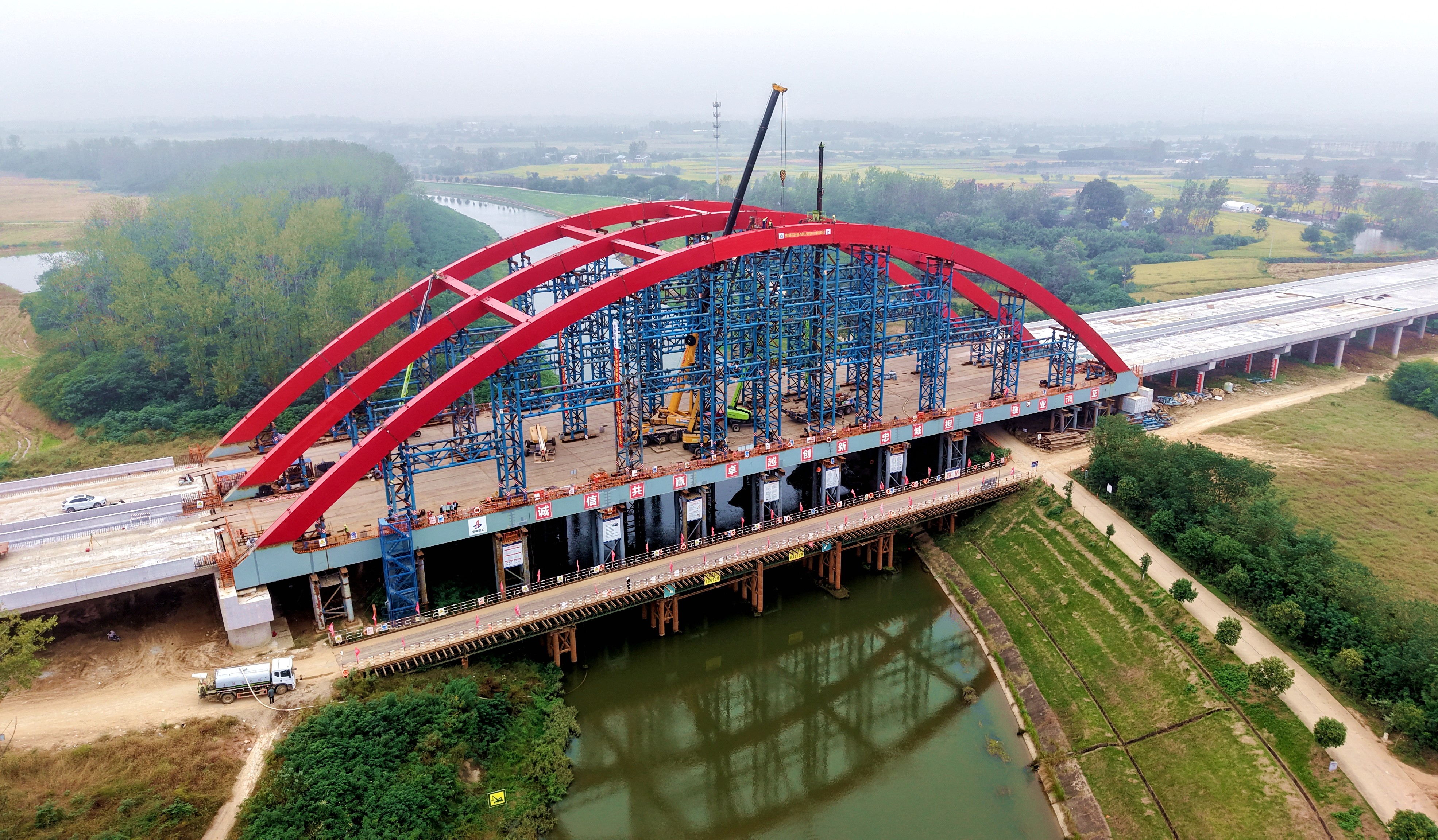 淠河總干渠大橋是項目關(guān)鍵控制性工程之一,主跨長140米,橋面寬39.6米,采用先梁后拱法施工。此次合龍的拱肋段長9米,單段重量達(dá)21.3噸,隨著吊裝作業(yè)精準(zhǔn)到位,標(biāo)志著該大橋主體結(jié)構(gòu)取得突破性進(jìn)展,為后續(xù)工程收官奠定基礎(chǔ)。施工中項目部緊緊圍繞質(zhì)量、安全、環(huán)保等目標(biāo),結(jié)合溫度監(jiān)測合龍口參數(shù),選擇適宜時段實現(xiàn)高精度合龍。
