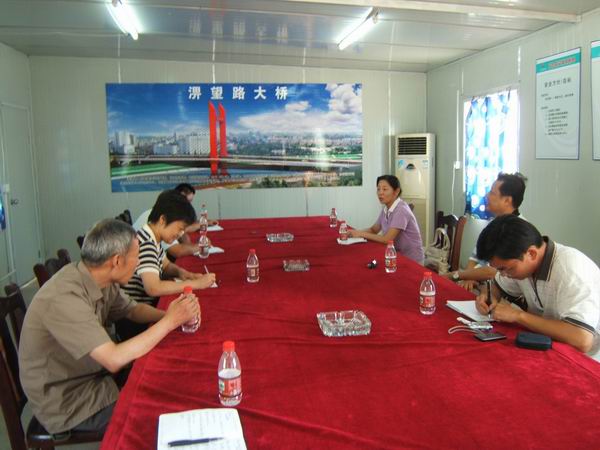 在項目部會議室,李主席等領導仔細聽取項目經理江仲明的介紹,不時關切地詢問工程相關情況。工會主席趙其榮向集團工會李主席等一行在高溫天氣下來公司淠望路大橋項目部慰問表示感謝。