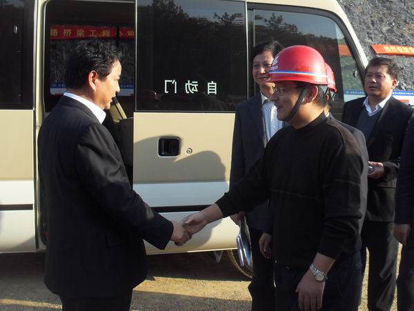 黃省長首先在施工現場聽取了績黃高速項目辦主任方昱對于工程建設情況的匯報。聽完匯報后,黃省長對公司和項目部的工作給予充分肯定和高度評價。他說,“省路橋公司是本省施工的龍頭企業,代表本省的形象,希望你們再接再厲,繼續做好規范化施工,高效管理,抓住當前機遇,努力打造優質工程,不斷提升企業形象,開辟新的市場,繼續做大做強。”汪總表態,“省路橋公司在黃省長的關懷下,近年來企業改制改革方面取得了一定成效,企業取得了巨大發展,我們將繼續做好施工規范化、精細化管理,在省領導的關心與支持下,我們一定會抓住機遇、迎接挑戰,把企業做大做強”。