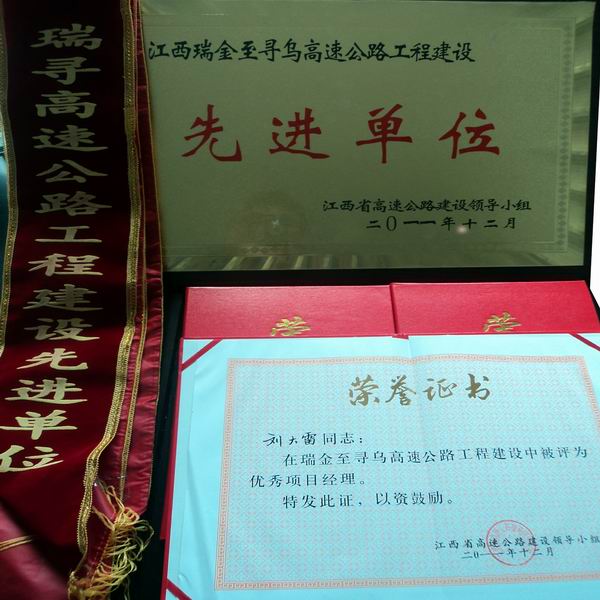 公司承建的瑞尋A7標(biāo)在公司的正確領(lǐng)導(dǎo)下,在以劉大雷同志為首的項(xiàng)目全體員工的共同奮斗下,經(jīng)過兩年的頑強(qiáng)拼搏、艱苦施工,終于實(shí)現(xiàn)了瑞尋高速公路的建成通車,在贛南大地描繪了一條絢麗的彩虹,書寫了一幅質(zhì)優(yōu)、安全、廉潔、環(huán)保的壯麗畫卷。瑞尋A7標(biāo)以工程質(zhì)量更優(yōu)、外觀形象更美、生態(tài)環(huán)境更佳、依法管理更嚴(yán)、安全廉潔更好為要求,以抓細(xì)節(jié)、樹精品、講程序、促規(guī)范、善創(chuàng)新、爭(zhēng)一流為管理理念,取得了一系列的優(yōu)異成績(jī)。在項(xiàng)目辦的兩次階段評(píng)比中均獲得A段第一,全線第二名的好成績(jī),還獲得了業(yè)主頒布的“先進(jìn)單位”稱號(hào),項(xiàng)目經(jīng)理劉大雷獲得了瑞尋項(xiàng)目“優(yōu)秀項(xiàng)目經(jīng)理”稱號(hào),項(xiàng)目總工戴聲慶、副經(jīng)理鳳爾飛、王星輝和黃明明四人獲得了“先進(jìn)個(gè)人”稱號(hào)。