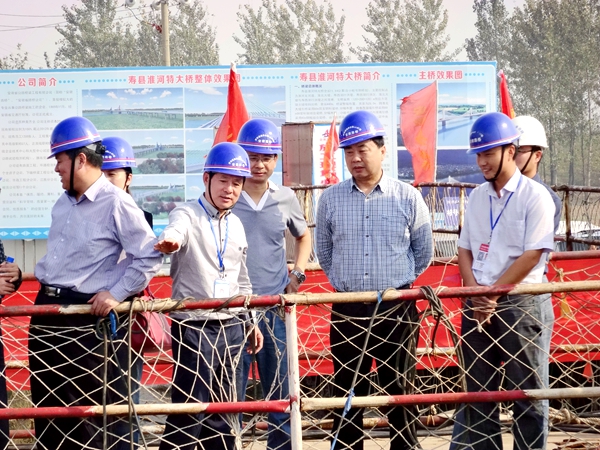 10月15日,安徽交通投資集團董事長喬傳福蒞臨濟祁高速01標淮河特大橋主墩鋼圍堰水下混凝土封底施工現場檢查指導工作。濟祁高速淮合段建設辦主任張其云陪同。