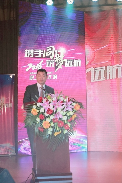 演出現場華燈璀璨,座無虛席,氣氛喜慶熱烈。匯演正式開始前,公司董事長、總經理孫學軍發表了熱情洋溢的致辭。他首先代表公司向蒞臨現場的嘉賓及長期以來堅持在公司各個崗位的員工及家屬,致以誠摯的問候和新春的美好祝愿,向默默奉獻,為路橋事業奠基的前輩們致以崇高的敬意。指出,2015年,是宏觀形勢錯綜復雜的一年,也是公司成績斐然的一年,在建工集團的正確領導下,全體員工凝心聚力,開拓奮進,取得了驕人的業績。充滿機遇和挑戰的“十三五”已經開局,全體路橋人要秉承優良傳統,凝心聚力,同舟共濟,譜寫安徽路橋新的輝煌。