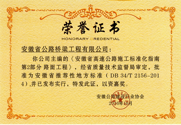 會上,省交通廳對在系列指南編寫工作中作出貢獻的單位和個人給予了表彰并頒發榮譽證書。公司主編的 《安徽省高速公路施工標準化指南 第2部分路面工程》(DB 34/T 2156-2014)獲得表彰,并經省質量技術監督局審定批準為安徽省推薦性地方標準,發布實行。