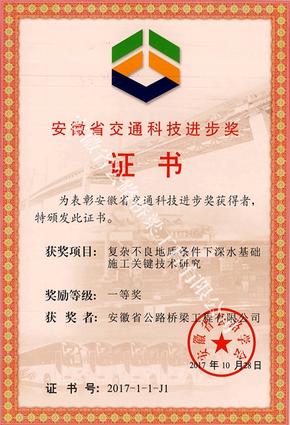 近日,第五屆安徽省公路學會交通科技進步獎評審結(jié)果正式發(fā)布,由公司完成的《復雜不良地質(zhì)條件下深水基礎(chǔ)施工關(guān)鍵技術(shù)研究》、《大曲率鋼橋面鋪裝雙層高粘SMA瀝青瑪蹄脂碎石施工技術(shù)》等兩項研究成果榮獲一等獎,《湖瀝青改性瀝青路用性能研究》研究成果榮獲三等獎。在10月29日召開的安徽省公路學會年會上,省交通廳巡視員、省公路學會理事長羅寧等領(lǐng)導為獲獎單位頒獎,公司副總經(jīng)理、總工程師彭申凱代表公司上臺領(lǐng)獎。