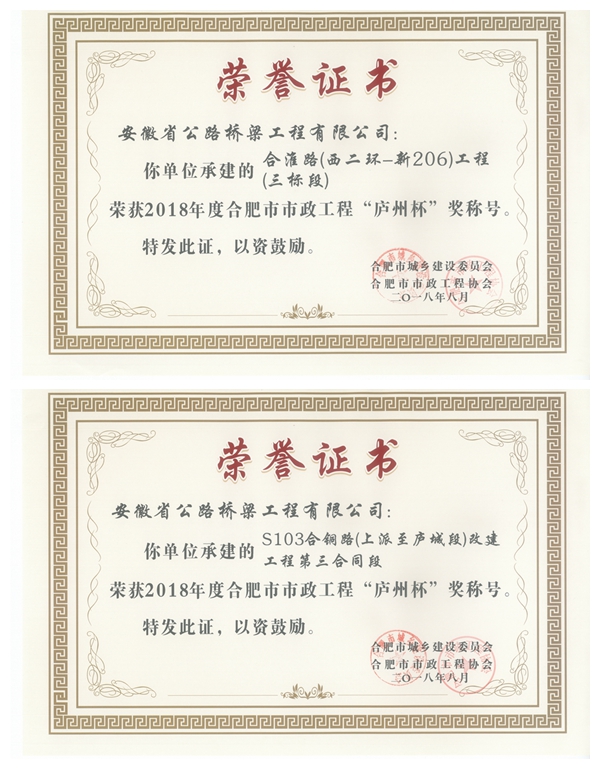 近日,從合肥市市政工程協(xié)會傳來喜訊,安徽路橋公司承建的S103合銅路(上派至廬城段)改建工程、合淮路(西二環(huán)-新206)三標兩項工程經合肥城鄉(xiāng)建委審定,榮獲2018年度合肥市政工程“廬州杯”獎。