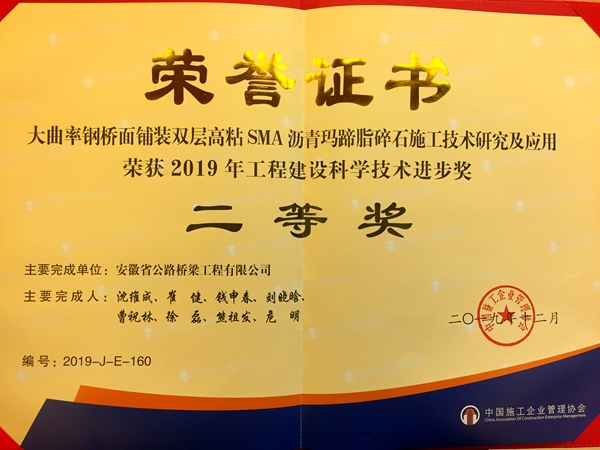 近日,2019年中國施工企業管理協會工程建設科學技術獎勵大會在天津召開,公司主持的課題成果“大曲率鋼橋面鋪裝雙層高粘SMA瀝青瑪蹄脂碎石施工技術”經過專家評審,榮獲二等獎。