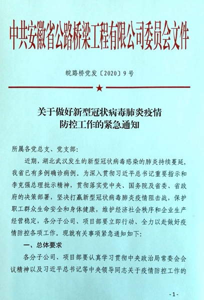 1月27日,公司黨委發布《關于做好新型冠狀病毒肺炎疫情防控工作的緊急通知》,對公司疫情防控工作進行具體部署,要求各分子公司、項目部立即行動,全力以赴做好疫情防控工作。同步組織成立公司疫情防控工作領導小組,由主要負責人擔任組長,統籌負責公司疫情防控指揮、協調工作;同時,所屬各生產單位也組織成立了疫情防控工作領導小組,全面加強對新型肺炎疫情防控工作的領導。實行領導班子成員輪流帶班制度,實時做好疫情防控指揮;建立疫情防控工作群,加強信息溝通和日常工作調度;各項目明確聯絡員,對疫情防控信息每日進行報告。