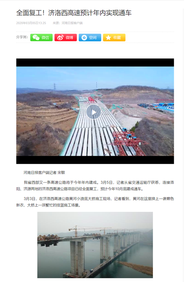 3月4日,公司承建的巢湖亞父路項目裕溪河大橋復工場景出現在人民網首頁,并刊文指出,為奪回疫情造成的停工損失,項目部嚴格落實防疫和生產要求,在保證安全質量的前提下,加班加點趕施工進度,確保大橋按期建成通車。河南衛視、鳳凰網等多家媒體記者走進公司承建的濟洛西高速黃河特大橋項目施工現場,實地采訪項目復工復產情況,并在中國網、河南日報客戶端、大河網進行了登載。安徽網聚焦G318池州至殷匯段改建工程復工建設,《今日宣州》以《按下交通建設“快進鍵”》為題專題報道了公司宣城PPP項目在疫情防控形勢逐漸向好的態勢下,搶抓建設黃金期,優化調整復工隊伍和施工組織計劃,把因疫情耽誤的工期搶回來,確保項目如期完工,開啟了復工建設趕進度模式。