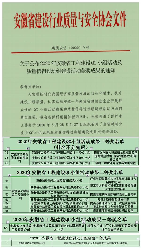 6月4日,安徽省建筑質(zhì)量與安全協(xié)會(huì)公布了2020年安徽省工程建設(shè)QC小組活動(dòng)及質(zhì)量信得過班組建設(shè)活動(dòng)獲獎(jiǎng)成果名單。公司QC小組申報(bào)的《提高區(qū)間管片拼裝錯(cuò)臺(tái)驗(yàn)收合格率》等3項(xiàng)成果榮獲一等獎(jiǎng),《環(huán)保節(jié)能型骨料加熱系統(tǒng)在瀝青拌合站中的應(yīng)用》等7項(xiàng)成果榮獲二等獎(jiǎng),《提升改擴(kuò)建山區(qū)公路瀝青下面層縱縫施工質(zhì)量合格率》榮獲三等獎(jiǎng)。同時(shí),甘肅銀百高速TY14標(biāo)項(xiàng)目箱梁預(yù)制班組榮獲安徽省工程建設(shè)信得過班組創(chuàng)建二等成果。
