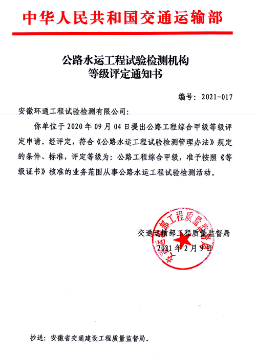 環通工程試驗檢測有限公司順利獲批交通部公路工程綜合甲級試驗檢測資質