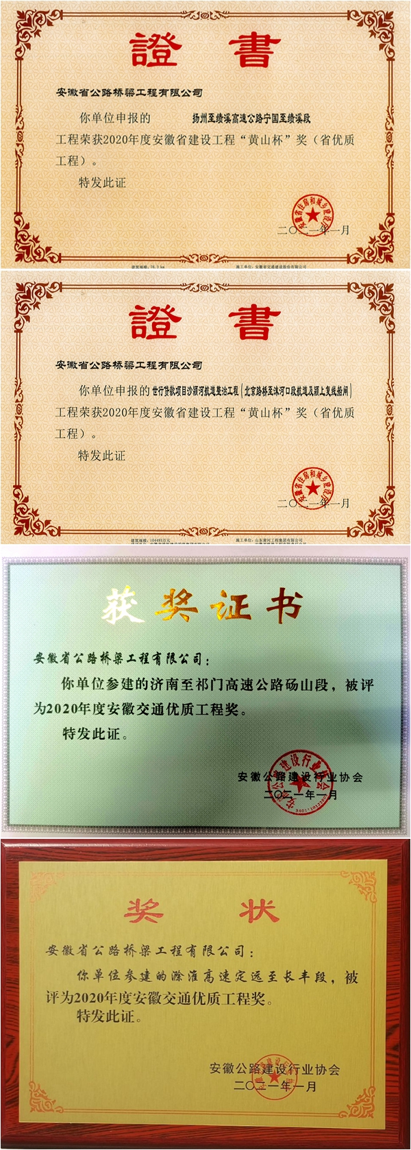 近日,2020年安徽省建設工程“黃山杯”和2020年度安徽交通優質工程獎在合肥頒獎。公司承建的揚績高速公路寧國至績溪段路基07標、沙潁河航道(北京路橋至沫河口段航道及潁上復線船閘)整治工程06標榮獲2020年安徽省建設工程“黃山杯”。滁淮高速公路定遠至長豐段路基05標、路面02標,濟祁高速碭山段項目榮獲2020年度安徽交通優質工程獎。