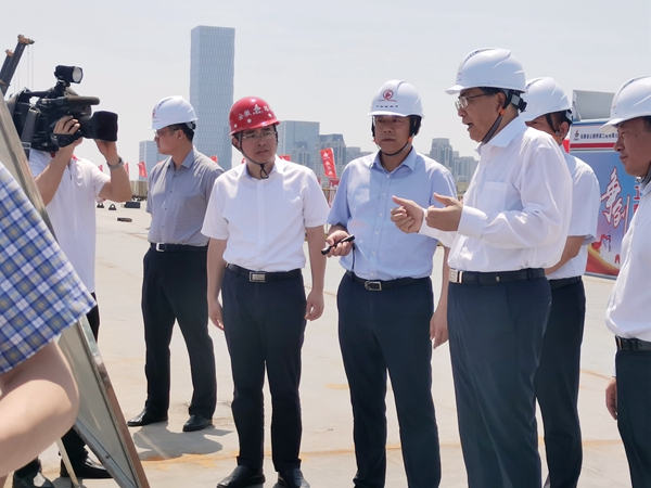 在項目主線橋鋼箱梁施工現場,李錦斌聽取了公司黨委書記、董事長錢申春關于項目概況、施工工藝和施工進度的匯報,仔細詢問了項目風險隱患識別、風險防范舉措、如何保障安全施工等工作開展情況,對項目的安全生產工作表示肯定。李錦斌再三叮囑,要堅持綜合管控、分類治理、壓實責任、全面覆蓋,做到排查精準、管理精細、措施精當,有效化解各類安全生產風險,真正實現技術過關、施工過關、質量過關、安全過關。