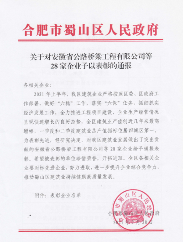 上半年,公司認真謀劃、統籌部署,堅持疫情防控和生產經營兩手抓、兩手硬,積極做好“六穩”工作、嚴格落實“六保”任務,企業生產經營情況始終保持增長態勢,為蜀山區建筑業總產值指標上半年位居全市首位做出了突出貢獻,為此,蜀山區人民政府對公司給予通報表彰。下一步,公司將珍惜榮譽,緊緊圍繞“十四五”戰略規劃,進一步提高競爭力,持續推進品質路橋卓越路橋建設,為推動蜀山區建筑業高質量發展作出新的更大貢獻。