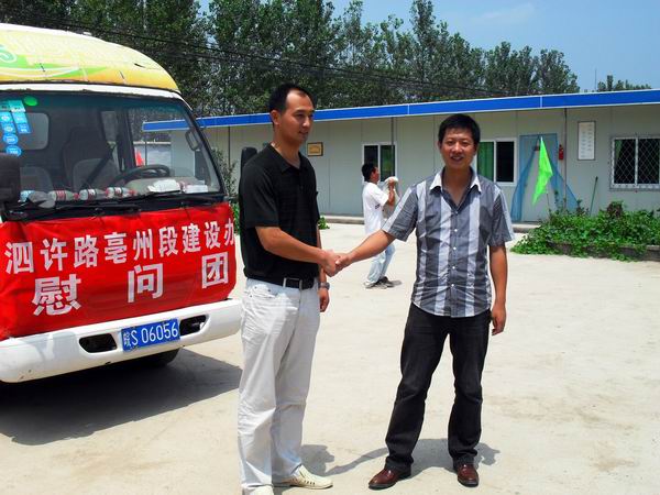安徽交投集團泗許高速亳州段建設辦到泗許01標慰問 發布時間:2009年07月29日 來源:泗許01標 發布人: 作者:章玉潔 瀏覽:5258次 連日來,持續高溫,7月24日上午,交投集團泗許高速亳州段建設辦綜合部部長王文飛一行帶著綠豆等防暑慰問品,冒著烈日來到泗許項目01標進行慰問,讓我標段的所有員工在高溫一線倍感清涼。