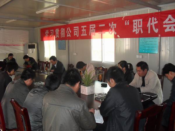 會上,項目經理杜海峰先向大家傳達了此次職代會的精神,并帶領大家認真學習了公司總經理汪衛東在職代會上的工作報告——《夯實管理基礎,拓展發展空間,為推動安徽路橋快速發展而努力奮進》。報告求真務實,目標明確,全面回顧了2009年的工作,碩果累累,令人歡欣;又周密部署了2010年的新任務,振奮人心,鼓舞士氣。
