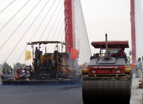 為了提高大橋橋面瀝青鋪裝質量,在攤鋪前項目部組織200余名工人突擊清理橋面表面浮漿,待沖刷干凈并涂上防水層后,開始攤鋪瀝青。在攤鋪過程中全部使用自動攤鋪機和重型壓路機,使攤鋪、碾壓等工序科學合理、規范達標。攤鋪施工剛一結束,黑亮寬敞而又整潔順暢的橋面就引來周邊過往市民的嘖嘖稱贊。